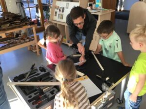 Bei KiTec – Kinder entdecken Technik können Kinder ihre Neugierde durch eigenständiges Tüfteln und Bauen stillen und ihre Fragen altersgerecht beantworten. Eine spannende Reise beginnt! In Kooperation mit der Wissensfabrik und der Firma Munsch Chemie Pumpen als Sponsor, können wir, die Kita Großmaischeid, dieses großartige Projekt anbieten. Warum stürzt ein hoher Turm nicht um? Wie baut man eine Brücke, dass sie nicht einbricht? Und wie wird aus einem Holzauto ein Elektroauto? Kinder sind von technischen Zusammenhängen fasziniert und versuchen schon früh, diese zu begreifen. Am 19.09.25 starteten die Kinder aus dem Pfiffikushaus, mit Ihrem Werkzeugführerschein. An 5 verschiedenen Stationstischen können sie den Umgang mit dem Hammer, der Zange, mit dem Schraubstock, der Pfeile, der Säge, dem Handbohrer und dem Schraubenzieher ausprobieren. Weiterführend werden die Kinder die Möglichkeit erhalten etwas zu konstruieren und ihr Bauwerk dann als Ergebnis mit nach Hause nehmen zu können. Das Werkeln soll in alltäglichen Abläufen Platz finden. Ziele des Projekts: Die Kinder konstruieren gemeinsam und bauen nach ihren eigenen Vorstellungen. Sie lernen den sicheren Umgang mit Werkzeugen (Werkzeugführerschein). Die Pfiffikusse arbeiten selbstständig und lösungsorientiert. Die Kinder lernen technische Fähigkeiten kennen und reflektieren dabei die Bedeutung von Technik.